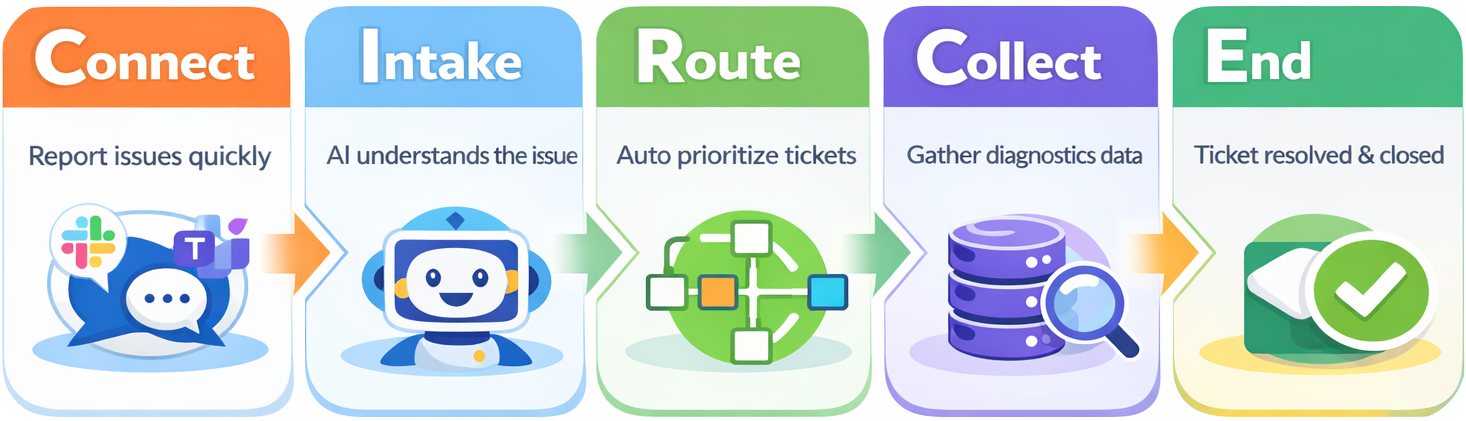 For issues that can't be resolved by AI, a ticket is created with a clear problem statement and diagnostic data attached.